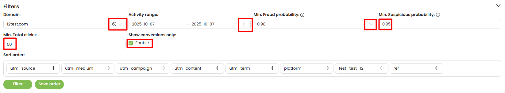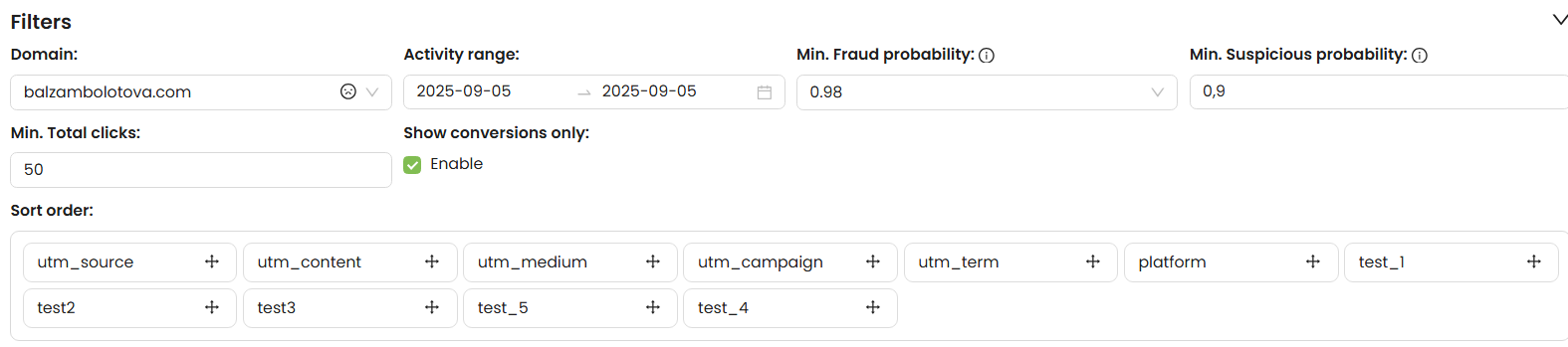 - Set Min. Fraud probability — filter out low-risk clicks.