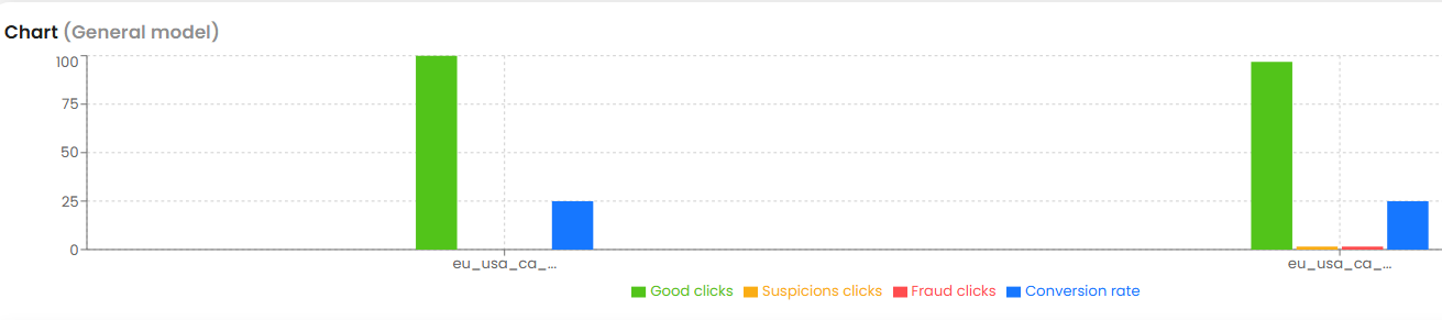 - Fraud clicks — traffic marked as fraudulent by the AI model (red)