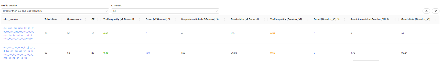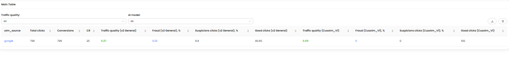 - Traffic quality — scoring based on AI assessment (V2 General or Custom V1)